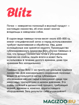 В сыром виде говяжьи почки весят около 600–800 гр, имеют специфический запах и перед использованием требуют вымачивания и обработки. Увы, даже охлаждённые они хранятся недолго. Преимущества сублимированного лакомства Blitz «Почки говяжьи» в том, что продукт полностью готов к употреблению: порезан на слайсы, лишён влаги и может быть использован в течение долгого времени, даже при хранении без холодильника.