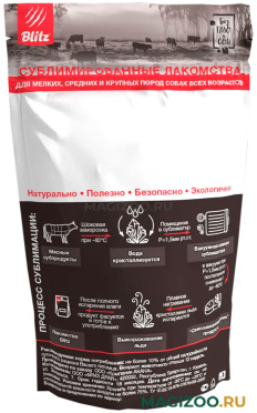 Сушёный бычий стейк Blitz для собак и щенков просто незаменим, если у Вас дома малыш, у которого меняются зубы, и он методично превращает в опилки мебель, или ваш питомец так активен, что его трудно занять, — предложите ему наше лакомство, и в вашем доме наступит тишина и покой.