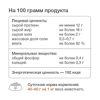 Рекомендуемая норма потребления составляет 10 % от суточного рациона животного старше 12 недель. Обеспечьте Вашему питомцу доступ к свежей питьевой воде.