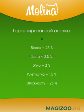 Информация о составе и ингредиентах, цветовом решении, технических и иных характеристиках, стране-изготовителе, внешнем виде и комплекте поставки товара носит справочный характер и основана на последних доступных к моменту публикации сведениях. Доставка данного товара осуществляется во все регионы РФ.Ассортимент MOLINA включает сухие корма для собак, влажные корма для собак и кошек, а также лакомства для собак и кошек.