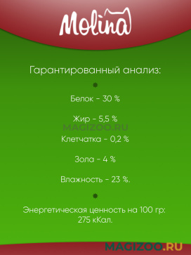 Информация о составе и ингредиентах, цветовом решении, технических и иных характеристиках, стране-изготовителе, внешнем виде и комплекте поставки товара носит справочный характер и основана на последних доступных к моменту публикации сведениях. Доставка данного товара осуществляется во все регионы РФ.Ассортимент MOLINA включает сухие корма для собак, влажные корма для собак и кошек, а также лакомства для собак и кошек.