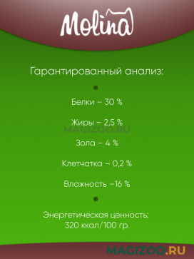 Информация о составе и ингредиентах, цветовом решении, технических и иных характеристиках, стране-изготовителе, внешнем виде и комплекте поставки товара носит справочный характер и основана на последних доступных к моменту публикации сведениях. Доставка данного товара осуществляется во все регионы РФ.Ассортимент MOLINA включает сухие корма для собак, влажные корма для собак и кошек, а также лакомства для собак и кошек.