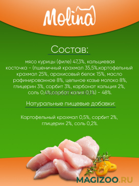 Большим спросом среди владельцев домашних животных пользуются лакомства ТМ Molina, которые производятся в Китае.