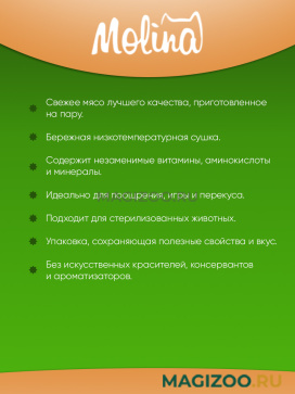 Информация о составе и ингредиентах, цветовом решении, технических и иных характеристиках, стране-изготовителе, внешнем виде и комплекте поставки товара носит справочный характер и основана на последних доступных к моменту публикации сведениях. Доставка данного товара осуществляется во все регионы РФ.Ассортимент MOLINA включает сухие корма для собак, влажные корма для собак и кошек, а также лакомства для собак и кошек.