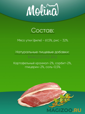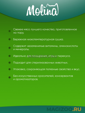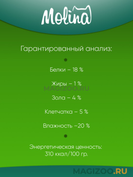 Информация о составе и ингредиентах, цветовом решении, технических и иных характеристиках, стране-изготовителе, внешнем виде и комплекте поставки товара носит справочный характер и основана на последних доступных к моменту публикации сведениях. Доставка данного товара осуществляется во все регионы РФ.Ассортимент MOLINA включает сухие корма для собак, влажные корма для собак и кошек, а также лакомства для собак и кошек.