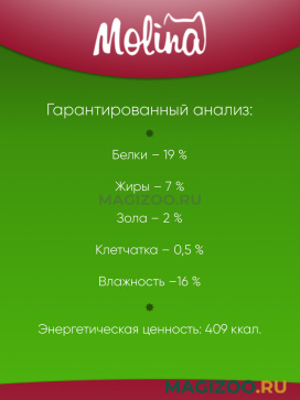 Информация о составе и ингредиентах, цветовом решении, технических и иных характеристиках, стране-изготовителе, внешнем виде и комплекте поставки товара носит справочный характер и основана на последних доступных к моменту публикации сведениях. Доставка данного товара осуществляется во все регионы РФ.Ассортимент MOLINA включает сухие корма для собак, влажные корма для собак и кошек, а также лакомства для собак и кошек.
