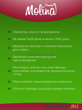Лакомство MOLINA для взрослых собак и щенков всех пород в виде палочек из ягненка и риса – побалуйте своего питомца вкусным и полезным лакомством!