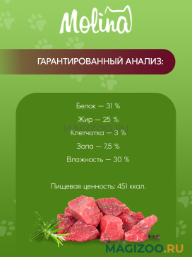 • ингредиенты, входящие в состав корма Molina, сертифицированы как пригодные для питания человека и производятся на территории ЕС.