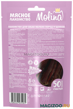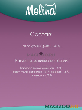 Натуральные мясные лакомства MOLINA давно завоевали сердца многих питомцев и их хозяев. Разнообразие видов и вкусов навсегда покорит сердце даже самого привередливого четвероногого гурмана!