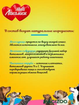 Основу лакомств составляют мясо курицы и молочная сыворотка.