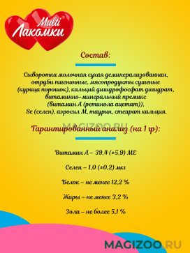 Мы ежедневно заботимся о себе, но порой забываем о здоровье своих питомцев. А ведь поддержание здоровья для них очень важно, так как от этого зависит общее состояние организма животного. Витаминное лакомство MultiЛакомки – кормовая добавка, созданная с учетом потребностей Вашего питомца, для улучшения и поддержания его здоровья.