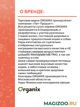 Информация о составе и ингредиентах, цветовом решении, технических и иных характеристиках, стране-изготовителе, внешнем виде и комплекте поставки товара носит справочный характер и основана на последних доступных к моменту публикации сведениях. Доставка данного товара осуществляется во все регионы РФ.Все рецепты сухих кормов ORGANIX производятся в Нидерландах и разработаны с учетом различных стадий жизни, состояний здоровья и пищевых предпочтений кошек и собак.