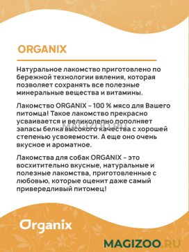 Лакомство ORGANIX – 100 % мясо для Вашего питомца! Такое лакомство прекрасно усваивается и великолепно пополняет запасы белка высокого качества с хорошей степенью усвояемости. А еще оно очень вкусное и ароматное!