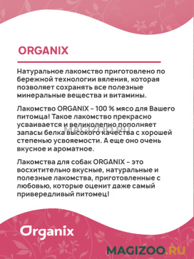 Лакомство ORGANIX – 100 % мясо для Вашего питомца! Такое лакомство прекрасно усваивается и великолепно пополняет запасы белка высокого качества с хорошей степенью усвояемости. А еще оно очень вкусное и ароматное!