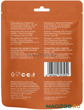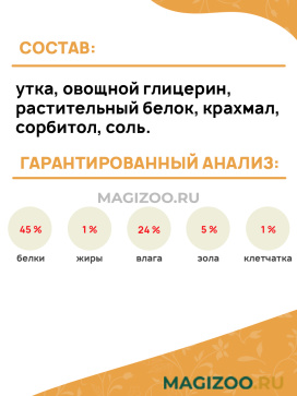 Состав: утка, овощной глицерин, растительный белок, крахмал, сорбитол, соль.