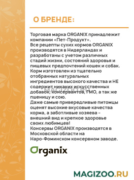 Информация о составе и ингредиентах, цветовом решении, технических и иных характеристиках, стране-изготовителе, внешнем виде и комплекте поставки товара носит справочный характер и основана на последних доступных к моменту публикации сведениях. Доставка данного товара осуществляется во все регионы РФ.Все рецепты сухих кормов ORGANIX производятся в Нидерландах и разработаны с учетом различных стадий жизни, состояний здоровья и пищевых предпочтений кошек и собак.
