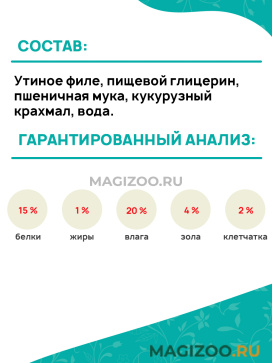 Лакомство обладает уникальной рецептурой, сохраняющей все полезные качества утки и неповторимый вкус безо всяких добавок и консервантов.