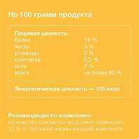 Лакомство не является основным кормом. 40 – 60 гр на 1 кг веса животного.