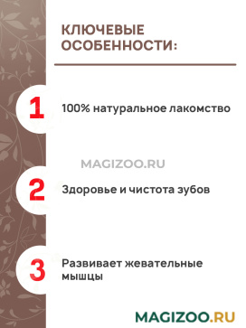 Натуральное хрустящее лакомство, богатое соединительной и хрящевой тканью. Предотвращает образование зубного налета и камня, избавляет от неприятного запаха из пасти, а также укрепляет десны и развивает жевательные мышцы.