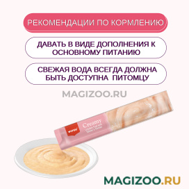 Витамины A, B2, B3, B5, D3, E в составе крем-лакомства поддерживают иммунитет и общее состояние здоровья вашего питомца. Ксантановая камедь обеспечивает нежную текстуру пюре.