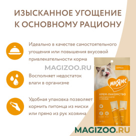 Утонченный вкус приводит кошек в восторг, а яркие эмоции довольных любимцев при кормлении с рук дарят хозяевам ощущение полного счастья. Подается как порционное угощение, или добавляется в виде аппетитного соуса к основному рациону для обогащения вкуса привычных блюд. Изготовлено по новейшей японской технологии и соответствует мировым стандартам качества. Удобная упаковка и кремовая текстура позволяют кормить кошку прямо с рук.