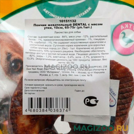 Состав: сыромятная кожа – 84 %, мясо утки – 12 %, растительный белок – 1 %, прежелатинизированный крахмал – 1 %, глицерин – 1 %, сорбитол – 1 %.