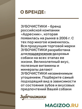 ЗУБОЧИСТИКИ – бренд российской компании «Адресник», которая появилась на рынке в 2006 г. С тех пор многое изменилось. Меняются привычки, потребности, вкусы. Ставя перед собой цель помогать людям в их каждодневных заботах о питомцах, компания «Адресник» использует все средства, чтобы идти в ногу со временем: в компании разрабатываются новые торговые марки, совершенствуются уже существующие бренды, налаживаются более эффективные способы производства.