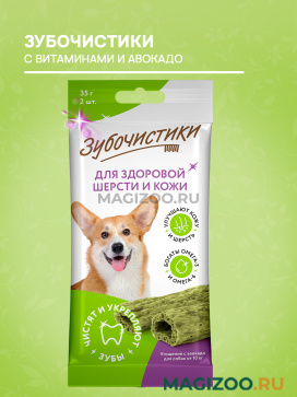 Зубочистики с авокадо имеют в составе рыбий жир, а значит, содержат необходимые для здоровья кожи и шерсти Омега-3 и Омега-6.