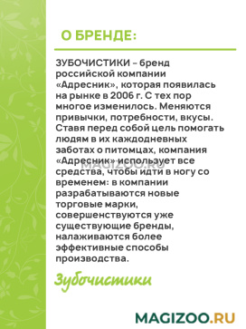 Вся продукция торговой марки ЗУБОЧИСТИКИ разработана для поддержания здоровья собаки на всех этапах ее жизни. Великолепный вкус, полезные витамины и минералы делают ЗУБОЧИСТИКИ незаменимым угощением. Подберите самый подходящий вид в зависимости от состояния зубов и вкусовых предпочтений Вашей собаки!