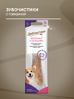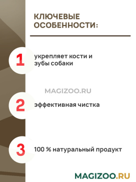 Запатентованная структура делает косточку достаточно жесткой, что обеспечивает максимально эффективную чистку зубов, сопоставимую с механической. Существенное содержание кальция укрепляет кости и зубы собаки.