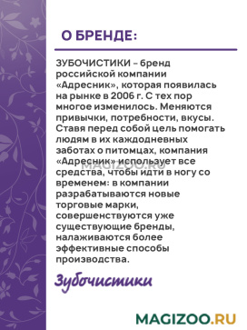 Информация о составе и ингредиентах, цветовом решении, технических и иных характеристиках, стране-изготовителе, внешнем виде и комплекте поставки товара носит справочный характер и основана на последних доступных к моменту публикации сведениях. Доставка данного товара осуществляется во все регионы РФ.Вся продукция торговой марки ЗУБОЧИСТИКИ разработана для поддержания здоровья собаки на всех этапах ее жизни. Великолепный вкус, полезные витамины и минералы делают ЗУБОЧИСТИКИ незаменимым угощением. Подберите самый подходящий вид в зависимости от состояния зубов и вкусовых предпочтений Вашей собаки!