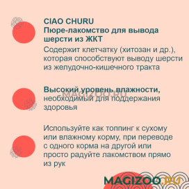 Супер-премиальное функциональное лакомство пюре CIAO Churu (ЧАО ЧУРУ) для кошек на основе кусочков нежного филе курицы от японского производителя Inaba изготовлено исключительно из натуральных полезных ингредиентов и отличается высоким процентом влажности, благодаря чему поддерживается водный баланс организма кошки.