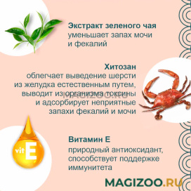 Содержит в составе клетчатку, которая способствует выводу шерсти и волосяных комочков из ЖКТ.