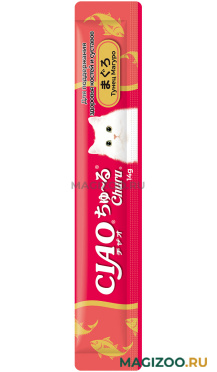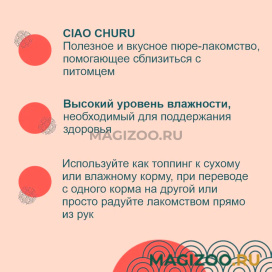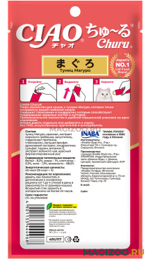 Супер-премиальное функциональное лакомство пюре CIAO Churu (ЧАО ЧУРУ) для кошек на основе кусочков мяса глубоководного тунца Магуро от японского производителя Inaba изготовлено исключительно из натуральных полезных ингредиентов и отличается высоким процентом влажности, благодаря чему поддерживается водный баланс организма кошки.