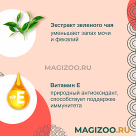 Во все продукты добавлен экстракт зелёного чая, который, благодаря содержанию катехина, нейтрализует неприятные запахи содержимого кишечника. Пюре-лакомство обогащено витамином Е — натуральным антиоксидантом, поддерживающим иммуннитет животного. Не содержит искусственных добавок, красителей и консервантов.
