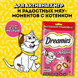 Лакомая говядинка в хрустящей вкусной подушечке не оставит равнодушным вашего питомца! Устройте ему настоящий праздник мяса! Давайте вашему котику лакомые подушечки DREAMIES, когда хотите побаловать его. В состав лакомства входят важные для кошки питательные вещества, витамины и минералы, а значит, такое угощение приносит не только радость, но и пользу.