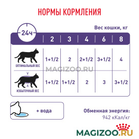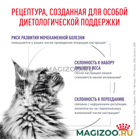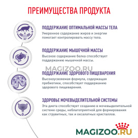 Помогает поддерживать оптимальный вес у кастрированных/стерилизованных кошек за счет умеренного содержания жиров и энергии, а также поддерживает мышечную массу за счет высокого содержания белка.