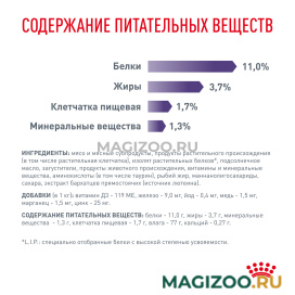 Состав: мясо и мясные субпродукты, продукты растительного происхождения (в том числе растительная клетчатка), изолят растительных белков, подсолнечное масло, загустители, продукты животного происхождения, витамины и минеральные вещества, аминокислоты (в том числе таурин), рыбий жир, маннанолигосахариды, сахара, экстракт бархатцев прямостоячих (источник лютеина).
