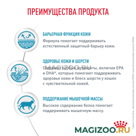 Полнорационный диетический корм для стерилизованных кошек, для поддержания защитных функций кожи при дерматозах и чрезмерном выпадении шерсти.