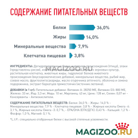Злаки, дегидратированные белки животного происхождения, изолят растительных белков*, мука из злаков, растительная клетчатка, животные жиры, гидролизат белков животного происхождения (вкусоароматические добавки), минеральные вещества, рыбий жир, аминокислоты, соевое масло, фруктоолигосахариды, масло огуречника аптечного, оболочка семян подорожника, экстракт бархатцев прямостоячих (источник лютеина).