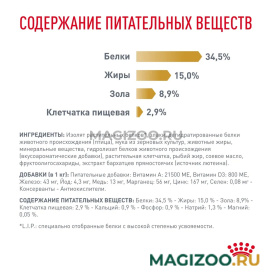 Изолят растительных белков*, злаки, дегидратированные белки животного происхождения (птица), мука из зерновых культур, животные жиры, минеральные вещества, гидролизат белков животного происхождения (вкусоароматические добавки), растительная клетчатка, рыбий жир, соевое масло, фруктоолигосахариды, экстракт бархатцев прямостоячих (источник лютеина). *L.I.P.: источники белков с высокой степенью усвояемости.