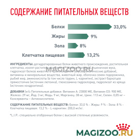 Дегидратированные белки животного происхождения, растительная клетчатка, изолят растительных белков*, маниок (тапиока), пшеничная мука, гидролизат белков животного происхождения (вкусоароматические добавки), витамины и минеральные вещества, животный жир, оболочка семян подорожника, рыбий жир, аминокислоты (в том числе таурин, L-карнитин), экстракт бархатцев прямостоячих (источник лютеина), глюкозамина гидрохлорид, гидролизат из хряща (источник хондроитина).