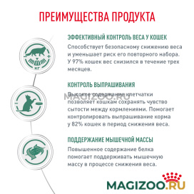- Эффективный контроль массы тела: способствует безопасному снижению веса и уменьшает риск его повторного набора. У 97 %(1)кошек вес снизился в течение трех месяцев.