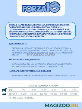 Картофельный крахмал, гороховый крахмал, гидролизат животных белков 16 %, целлюлозные волокна, пивные дрожжи, рыбий жир, сушеные морские водоросли (Ascophyllum nodosum) 4 %, свекольный жом, минеральные вещества, маннанолигосахариды (МОС), фруктоолигосахариды (ФОС), Юкка Шидигера.
