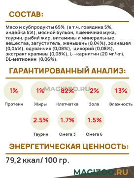 Мясо и субпродукты 65% (в т.ч. говядина 5%, индейка 5%), мясной бульон, пшеничная мука, таурин, рыбий жир, витамины и минеральные вещества, загуститель, женьшень (0,04%), эхинацея (0,04%), одуванчик (0,08%), цикорий (0,08%), экстракт крапивы (0,08%), L-–карнитин (20 мг/кг), DL-метионин (0,06%).