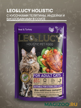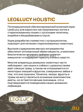 Полнорационный сбалансированный влажный корм Leo&Lucy для взрослых кастрированных котов и стерилизованных кошек с кусочками телятины, индейки и биодобавками в соусе.
