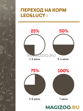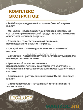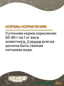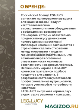 Информация о составе и ингредиентах, цветовом решении, технических и иных характеристиках, стране-изготовителе, внешнем виде и комплекте поставки товара носит справочный характер и основана на последних доступных к моменту публикации сведениях. Доставка данного товара осуществляется во все регионы РФ.Философия компании заключается в стремлении сделать отношения между животными и людьми гармоничными и счастливыми, что возможно через осознание ответственности хозяина за безопасность и здоровье любимца. Особенность кормов LEO&LUCY кроется в тщательном подборе продуктов для рациона. В разработке составов участвовали профессиональные нутрициологи, которые учли особые потребности животных.