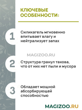Структура гранул такова, что от них нет пыли и мусора, при этом они обладают мощной абсорбирующей способностью. Питомец выходит из туалета с чистыми лапками и не оставляет на полу следы. Силикагель мгновенно впитывает влагу и нейтрализует запах.