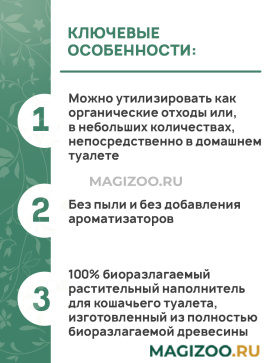 - 100% биоразлагаемый растительный наполнитель для кошачьего туалета, изготовленный из полностью биоразлагаемой древесины.