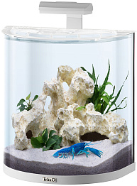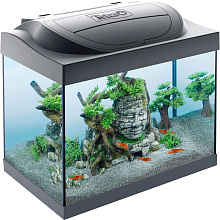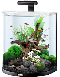 Маленький, стеклянный, уже включены аэрация, подсветка и фильтр. Только добавь воды и рыбку!